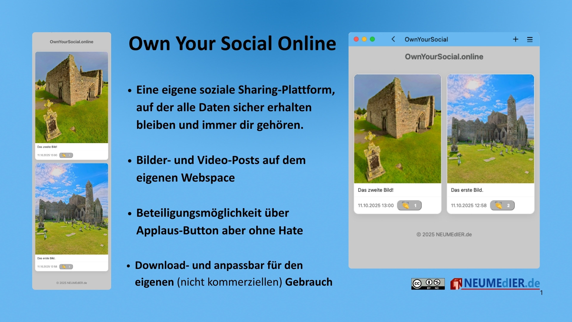 Eine eigene soziale Sharing-Plattform, auf der alle Daten sicher erhalten bleiben und immer dir gehören. Bilder- und Video-Posts auf dem eigenen Webspace, Beteiligungsmöglichkeit über Applaus-Button aber ohne Hate. Download- und anpassbar für den eigenen (nicht kommerziellen) Gebrauch: Das Beispiel der Sharing-Plattform findet sich hier: neumedier.social. Und hier gehts zu den Erläuterungen und Download